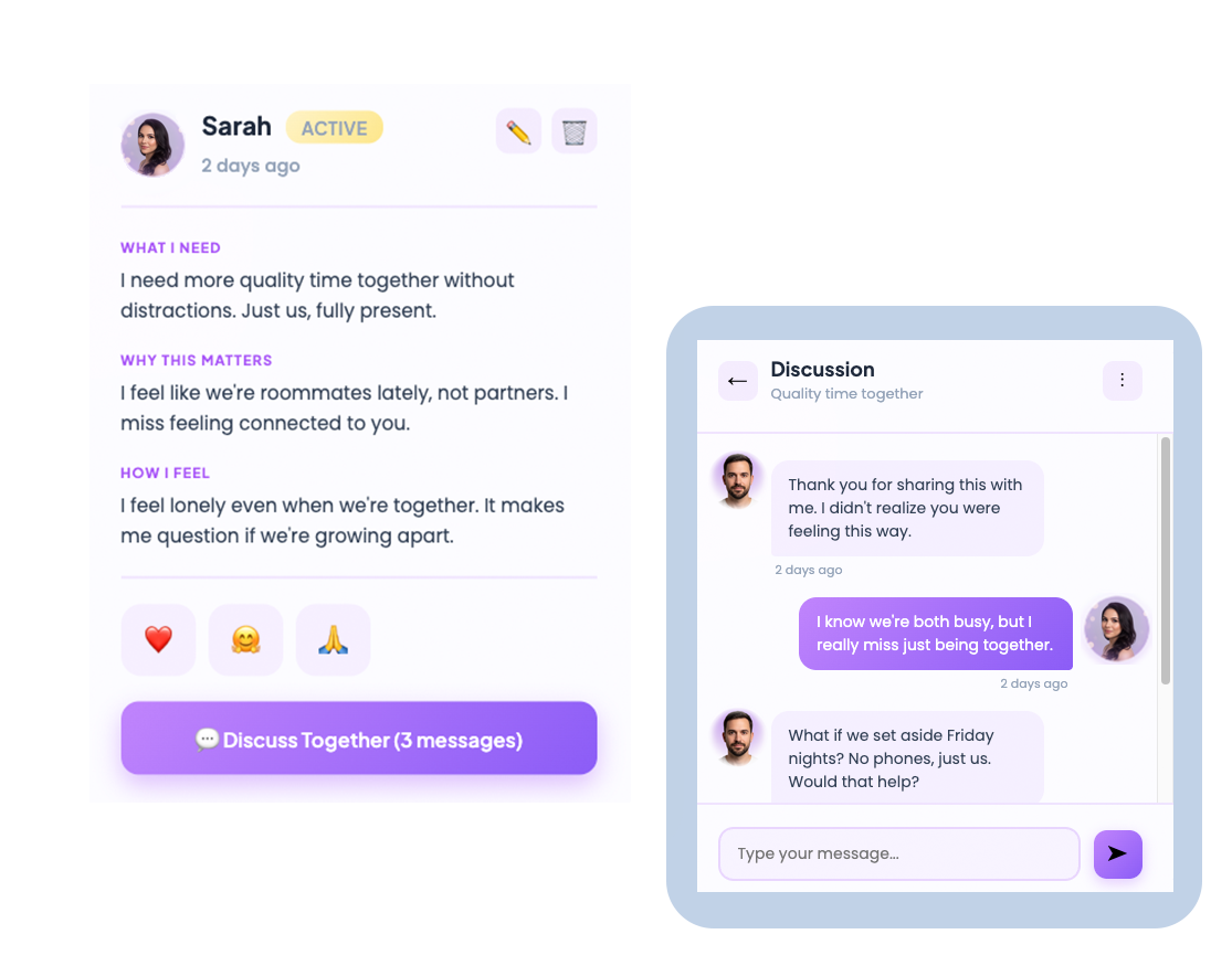 Express your needs in a structured, thoughtful way. No pressure to perform. No defensive arguments.